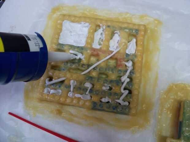 No estoy seguro si esto fue un error o no, pero después tuve varias capas, apliqué algunas calafateo de látex en las depresiones. Esperaba que haría más fuerte por lo que no distorsionan cuando derramé en el yeso. Por desgracia, es un tipo diferente de látex y no vincularse adecuadamente con el material del molde. También, tomó realmente mucho tiempo (como dos días) para curar y creo que lo que solventes se mezclaron en ablande el material del molde, convirtiéndolo en blanco. Todo ha salido al final, pero creo que yo usaría algo más en el futuro, como un sellador de silicona curado rápido cubierta con otra capa de látex.