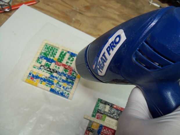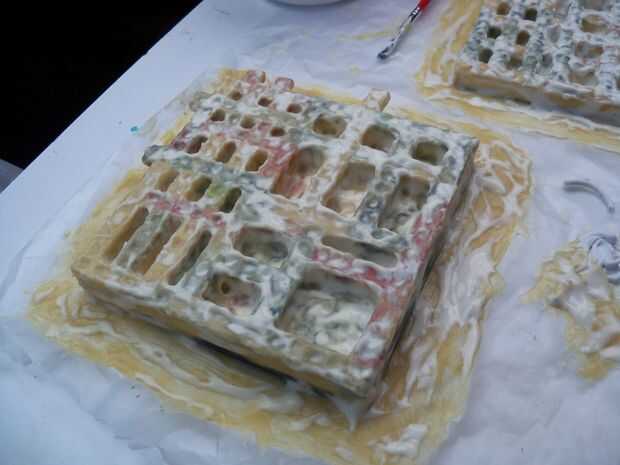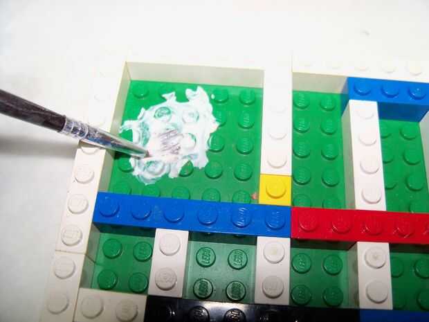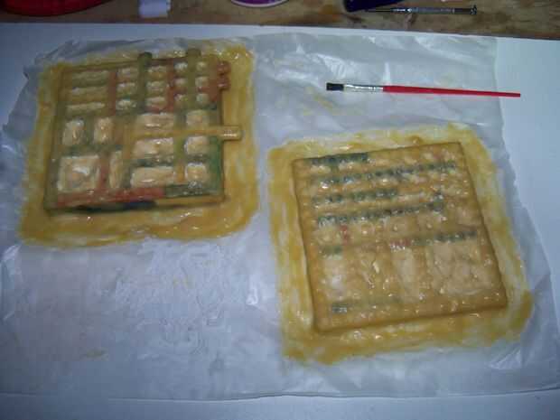 Coloque un pedazo de papel de cera sobre su espacio de trabajo, he utilizado un tablero que pude tomar para trabajar conmigo. Con pinceles baratos, comienza aplicando una capa muy delgada de látex sobre cada uno de tus moldes, asegurándose de que en todos los rincones y grietas. Finalizado, aplicar calor y deje que se cure del blanco a bronceado, a continuación, añadir otra capa.