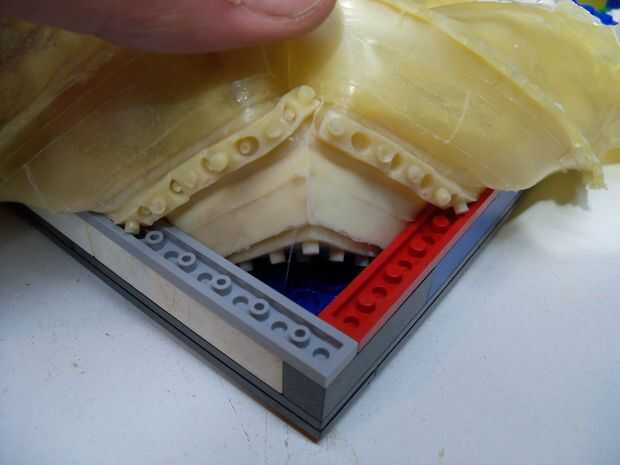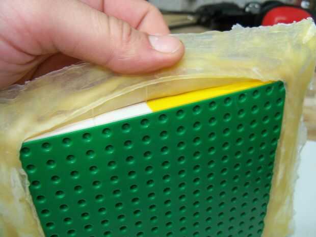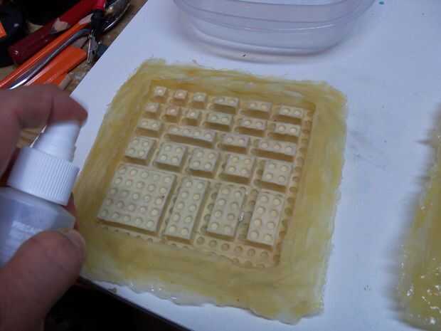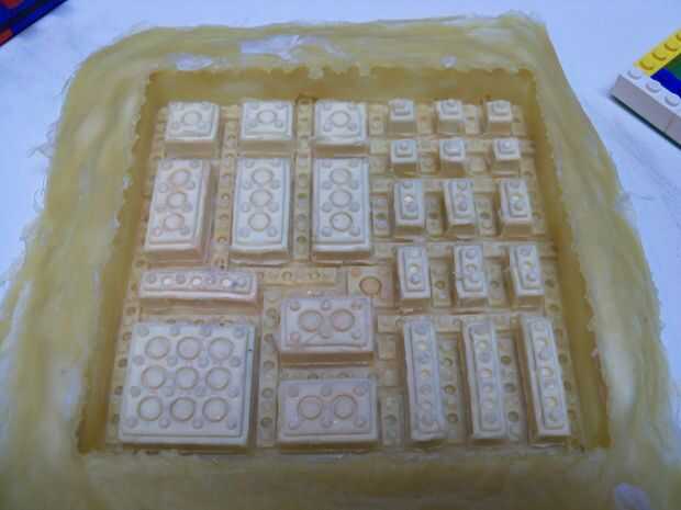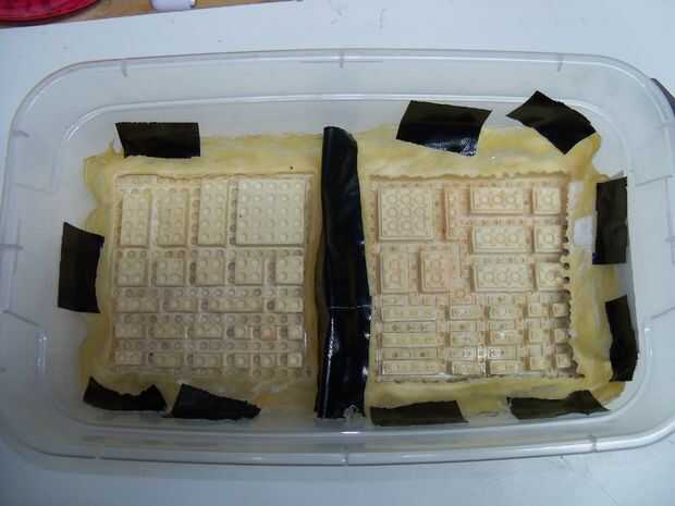 Cuando se seca, la cinta los moldes en la parte inferior de un envase impermeable nivel. Utilizado era un poco demasiado pequeño y ligeramente distorsionado algunos de los ladrillos, pero no era demasiado malo.