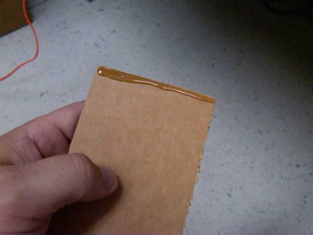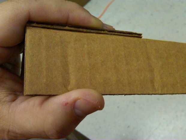 Luego coloque la tira de cartón en el borde pegado en un ángulo de 90 grados, alineando la esquina a un lado. Debe tener un pedazo largo colgando un lado, que se curva y utilizar para los lados restantes.