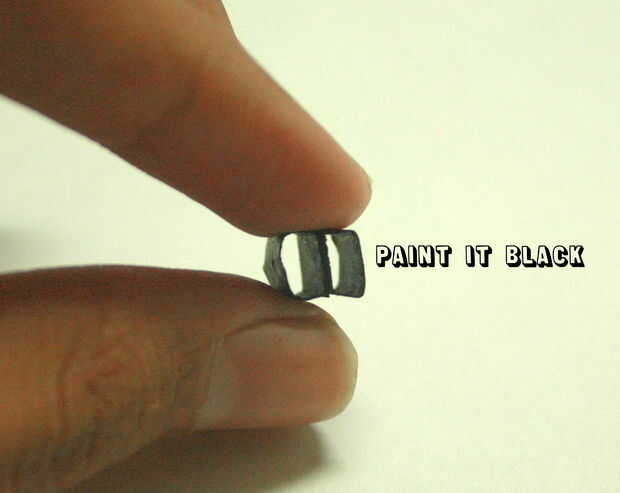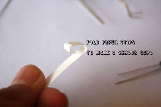 2. luego doblar una tira de hoja de papel como se muestra. Hacer dos de estas estructuras para que el LED y el fotodiodo encajen firmemente en él. Estos conjuntos juntos por el pegamento y píntalas de negro.