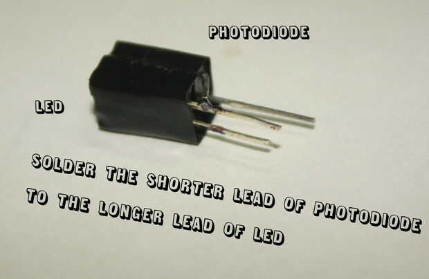 3. Inserte el LED y el fotodiodo en ellos de tal manera que el positivo (más) del LED está sobre el cable más corto del fotodiodo.