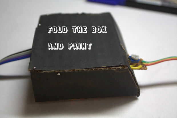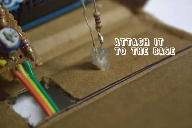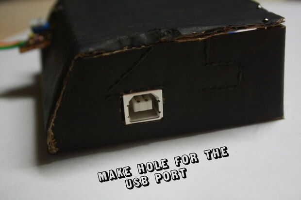 Hacer un agujero pequeño (5mm) para fijar el LED de estado. Solde un resistor de 270 ohm al LED e insértela en el pin 12 en el Arduino.