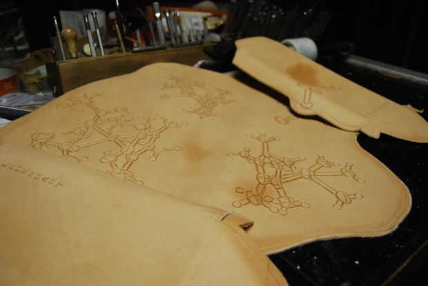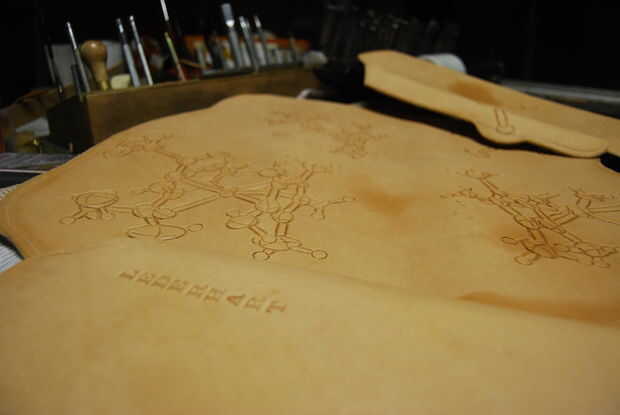 Usted necesitará un arsenal de diferentes herramientas para realzar los diseños en la piel. Para hacer esto a mano, necesitarás un cuchillo giratorio para tallar los bordes de los diseños, una serie de cartabones de diferentes tamaños, unos sellos de círculo, y una herramienta de segundo plano es opcional. Esto puede ser un proceso desperdiciador de tiempo así que sólo caso (mojada) una pieza de cuero a la vez.