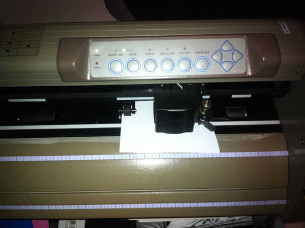 El diseño es entonces enviado a un cortador del vinilo para cortar en vinilo de la muestra.