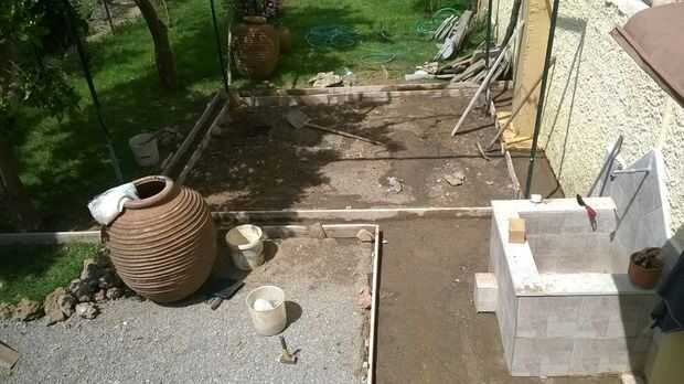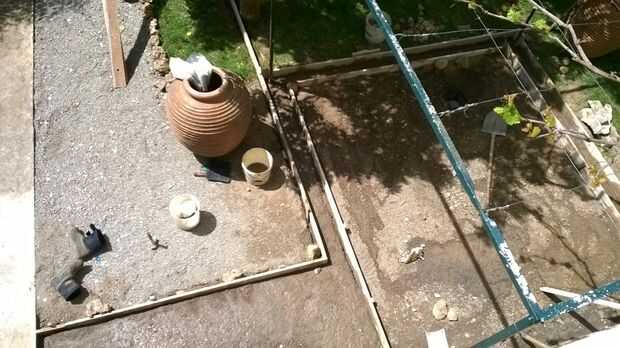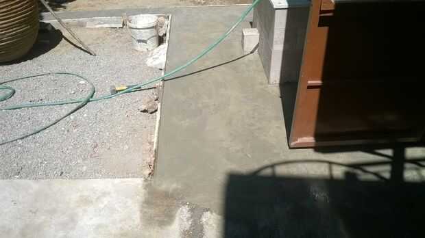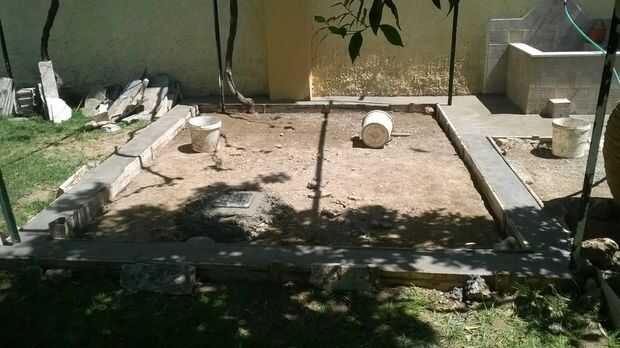 He hecho el hormigón con la ayuda de mi padre. Era común hormigón mezclado con arena y algunas gravas para hacerla más fuerte. Lo mezclamos en la carretilla, porque no tenemos una hormigonera. Después de se vierte entre las tablas y lo enderezó. Lo dejamos para un día que se seque, vertiendo agua cada pocas horas en la superficie para que no agriete.