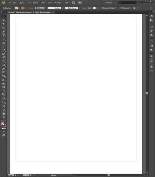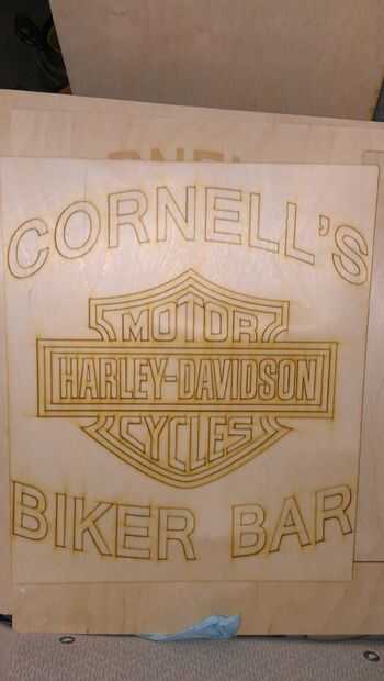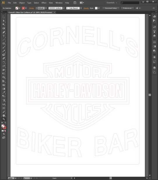 Las cortadoras láser en TechShop interpretan líneas rojas en imágenes vectoriales como las líneas de corte. Por lo tanto, tuve que dibujar la siguiente imagen con contornos rojo y sin relleno. Sólo utilicé los cuadros de texto para escribir a "CORNELL" y "BIKER BAR." También tuve suerte de encontrar un vector de la imagen del logo de Harley-Davidson que simplemente podía cortar y pegar (y ajustar para tener un contorno de color rojo y sin relleno). Yo entonces había rodeado todo con un rectángulo redondeado y el diseño era completo. Ver imagen #1.