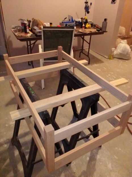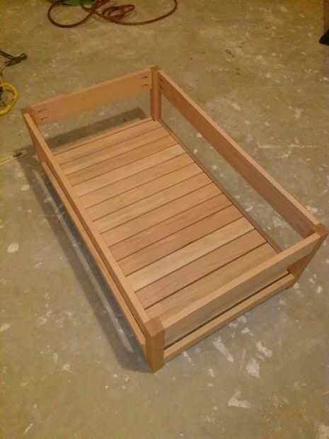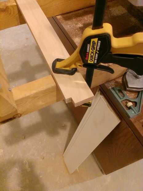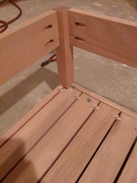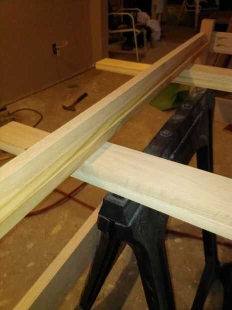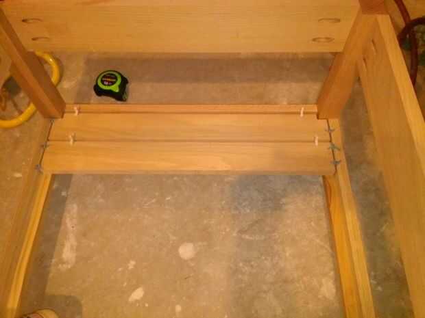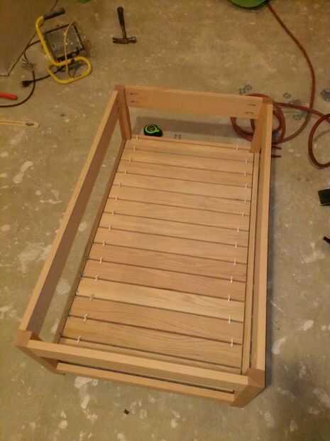Ahora coloque la base en el piso o trabajo superficial derecha. Los listones se hacen de la 14 22-1/4" 1 x 3 tableros. Están espaciadas 1/4" alejados uno del otro y 1/8" de la estructura base de cualquier lado. Las muescas se necesita cortará en dos de los listones a ambos lados por lo que puede envolver alrededor de las piernas (ver imágenes de aclaración). He encontrado a algunos espaciadores del azulejo repuesto ahí que acaba de pasar a ser del tamaño correcto y encontró que trabajaron muy bien para lograr la separación adecuada y te recomiendo usarlos. Encolar los listones a lo largo de la tira de pino y coloque un clavo de brad a cada lado para mantener en su lugar. Después se colocan los listones, los espaciadores pueden eliminarse.