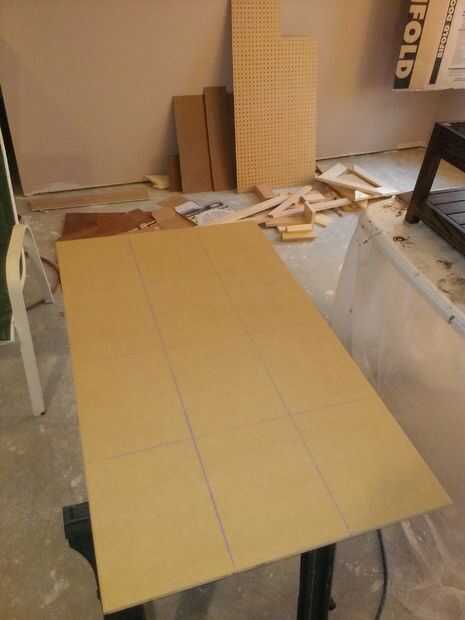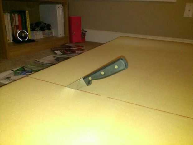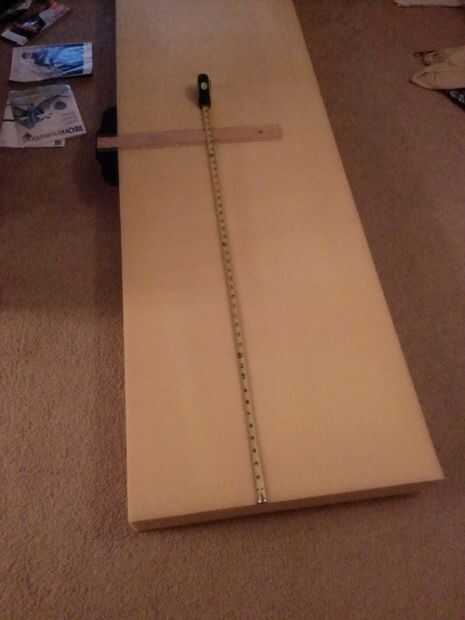 Ahora es el momento para hacer el cojín. El primer paso es cortar y montar la espuma. Mida y marque en la espuma a 37-3/4" de largo y 2' amplia (mi ya la anchura apropiada de la espuma). A continuación, cortar la espuma a lo largo de la marca con un gran cuchillo serrado (o un cortador de espuma de lujo si lo tiene). Ahora preparar el MDF del forro para acolchonamiento (opcional) por los agujeros de perforación. Hice un 2 x 3 de acolchonamiento de patrón, así que marqué el MDF con una línea de tiza en un patrón que hace una cuadrícula de 3 x 4 y perforar los agujeros en la intersección de las líneas de tiza. Por último, pegar la espuma y el forro con pegamento del gorila y dejar secar.