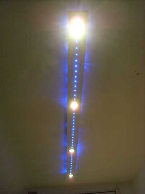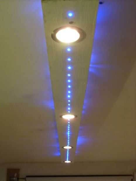 me gusta el estilo de diseño de interior minimalista. No me gusta cuanto cuesta! Por lo que puse sobre un largo elegante luz de techo del edificio, que comenzó como un trozo de rodapié. Quería tener 4 halógenos por mecheros y también algunos cool LED azul integrado en ella para que se vea cool. También quería detrás encendido, arrojando charcos de luz indirecta en el techo. Todas estas luces pueden ser conectado / desconectado separados entre sí. Yo no he entrado en detalle intrincado en este instructable en términos materiales o formas específicas de hacer las cosas como no es posible establecer que las cosas tienen que hacerse. Ser creativo, que es lo que se trata!