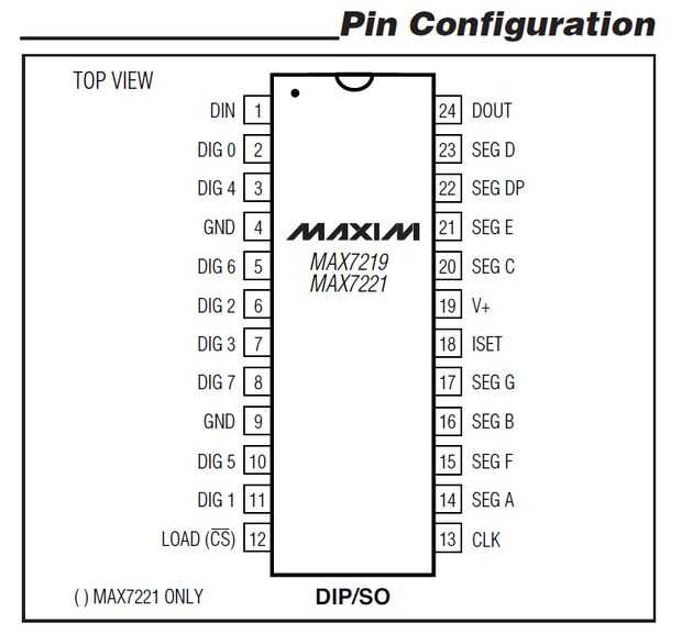 Para decir el Max7221/7219 qué el corriente/voltaje máximo para proporcionar, tenemos que conectar un resistor entre los V + y pernos ISET. Esta resistencia se denomina en la hoja de datos (PDF ADVERTENCIA) RSET. Vea esta página para obtener más información sobre los valores.
