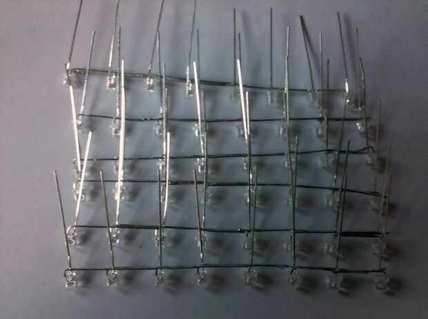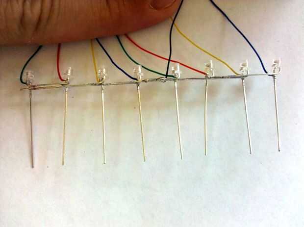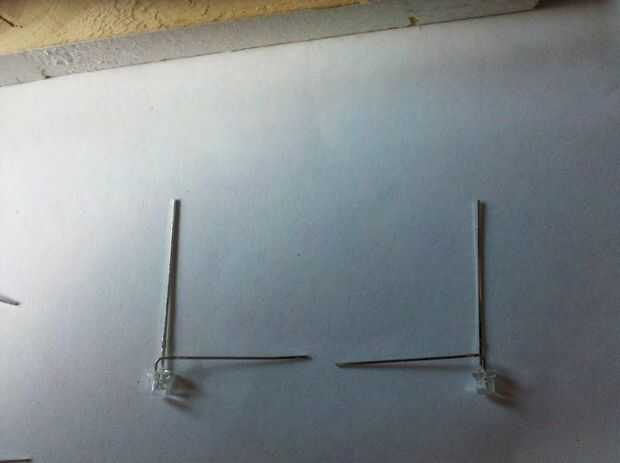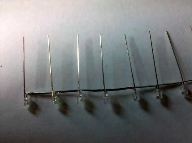 A se dobla el cable negativo del LED para formar una barra que nos va conectando con el LED. Tomando 8 LED, doble 7 de la lleva una dirección y el otro en el contrario (véase cuadro 2). Es importante mantener la curva tan cerca el LED como sea posible - para que unos alicates pequeños son útiles.