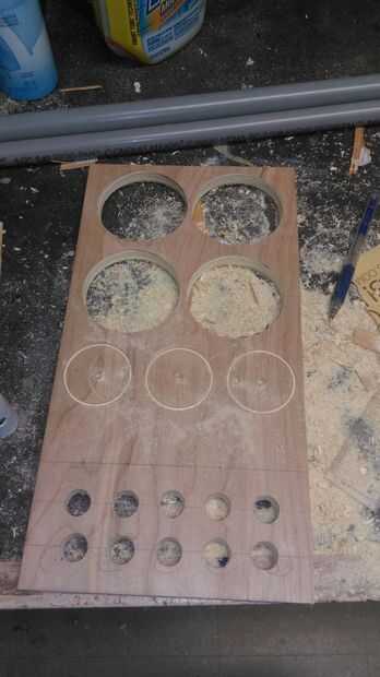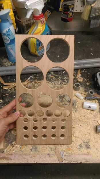 quería un soporte extraíble que podía sacar y poner en su escritorio mientras trabajaba. Dejé un espacio en el pecho para que Nestlé en cuando no está utilizando, por lo que medí que espacio y corte la madera a ese tamaño, entonces los orificios perforados en la madera. Usé diferentes tamaños. Mi idea es que los agujeros más grandes pueden contener algunos marcadores, tijeras o lo que sea más grandes utensilios que usa y las pequeñas para sus pinceles, plumas, lápices. Lo que quiera.