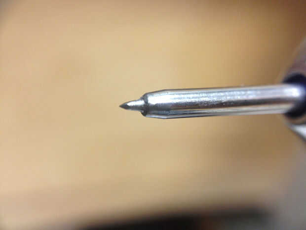 Ahora inscribir la marca de un fabricante y un sello que muestra las aleaciones metal dentro del ring. Una manera de hacer esto es utilizar un sello fabricado pero en delicados anillos que prefiero hacer esta usando una punta de trazado casera como ponchar un delicado anillo con un sello grande puede deformar el anillo.