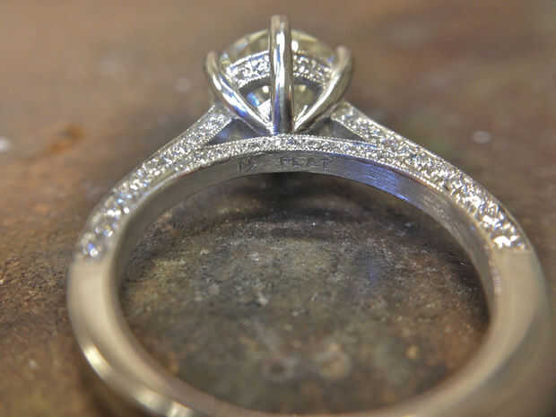 Puse mi granito de arena trazado en mi herramienta rotatoria y grabar las marcas adecuadas en el interior del anillo. Ya que este anillo es de 95/5 Platino/Rutenio inscribir "PLAT" dentro del ring. Para un anillo marcado "PLAT" o "Platino" es tiene que ser al menos 95% aleación de platino pura.