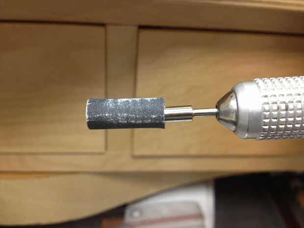 Luego utilizo mi mandril lija de hoja para terminar ligeramente el interior del anillo, quitar las rebabas de metal pequeño que resultó del proceso de grabado.