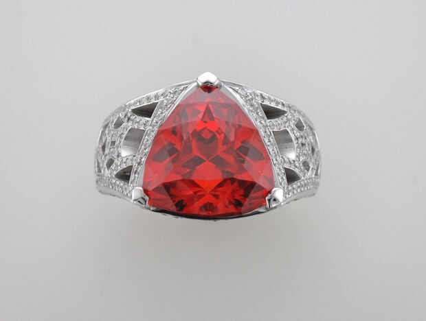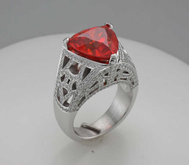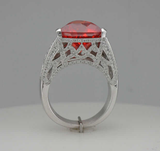 La primera pieza es un anillo de oro blanco con un zafiro naranja grande y 328 pequeños diamantes. La mayoría de los diamantes son alrededor de .8mm de diámetro.