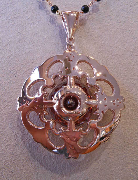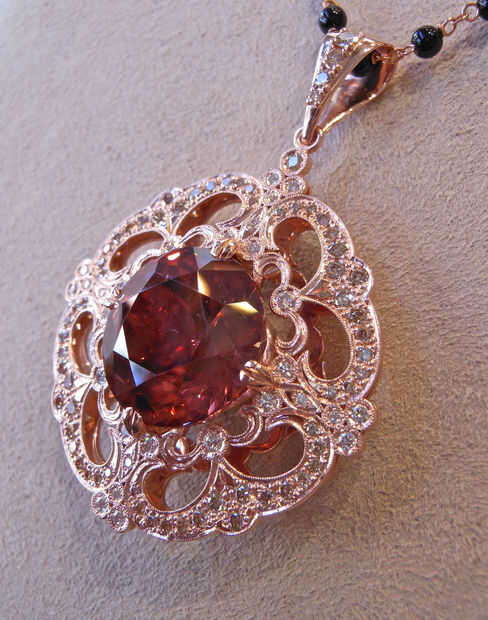 La segunda pieza es un colgante de oro rosa con un circón rojo grande rodeado de diamantes blancos y champagne.
