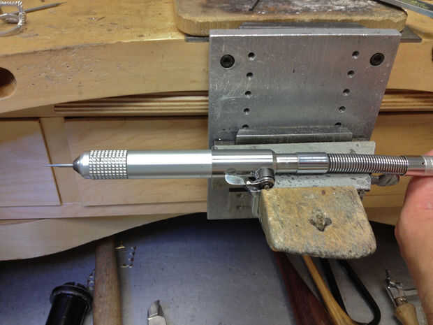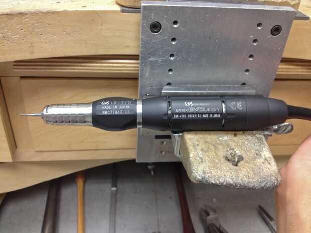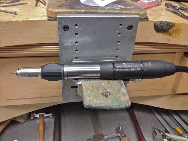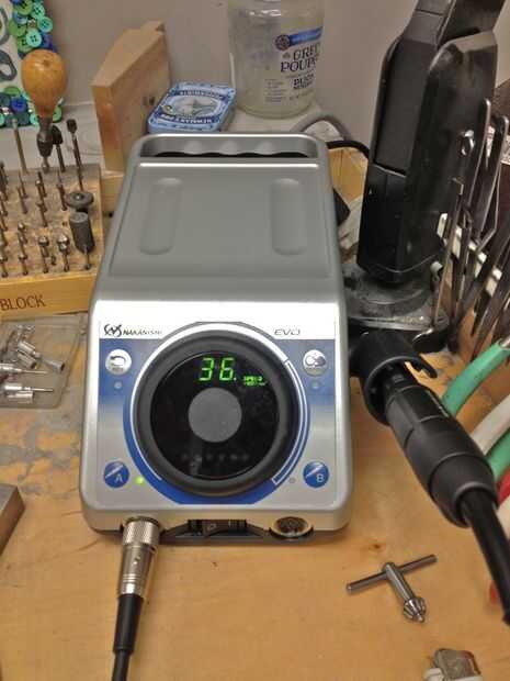 4.) herramientas rotatorias. Probablemente utilizar esta más que cualquier otro banco herramienta. Herramientas rotatorias se utilizan para taladrar, pulir y lijar. Tengo flexshaft Foredom dos motores-uno con una pieza de cambio rápido de mano y otro con una pieza de mano #30. El cambio rápido las piezas de mano son realmente agradables para el establecimiento de piedra ya que puede cambiar muy rápido de fresas. La pieza de mano #30 es ideal para usar brocas, rollos de lija grandes y grandes burs rotatorios. El Foredom flexión motores eje pasado la mina para siempre son más de 15 años de edad. La pieza de mano #30 también durarán para siempre. Administrar desgaste las piezas de mano rápida cada 1 1/2 a 2 años. Recientemente comencé a usar una herramienta giratoria de micromotor NSK evolución EMax y es pijama del gato. Es simplemente la mejor herramienta rotatoria que siempre he usado y es conocidos por ser extremadamente robustos. La gran ventaja de micromotor rotatorio herramientas es que el motor está en la pieza de mano por lo que no estamos luchando la tensión de un flex eje coche cable-es una bonita gran cosa cuando haces trabajo delicado y ajuste de piedra.