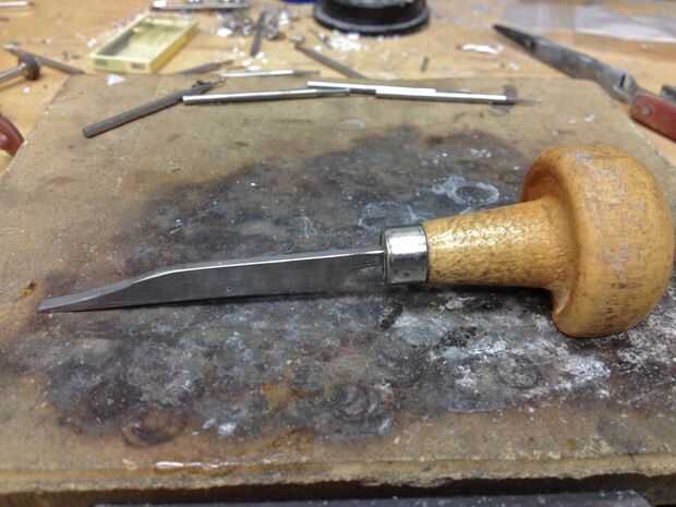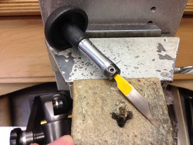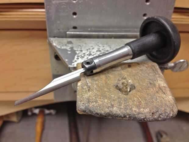 Aquí es como preparación y afilar mis buriles. El cuidado que usted toma asegurándose de que sus buriles son limpias y sharp hará una gran diferencia en su brillante corte y ajuste en obra de piedra. Buriles se suelen vender en forma larga, sin cortar, así que lo primero que tienes que hacer es moler lejos la espiga un poco por lo que el buril se puede caber a un mango. Esto se hace utilizando una esmeriladora de banco estándar con un pulido de la rueda. Sólo moler lejos un poco pequeño a la vez. Mantenga una pequeña taza de agua junto a su amoladora de banco y encestar el buril en así que no consigue demasiado caliente-esto le ayudará a mantener una ventaja después de afilar. Mangos de madera son tradicionales en la espera pero me gusta mucho el nuevo estilo rápido cambiar manijas que permiten montar varios buriles de estilo para una sola manija.