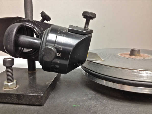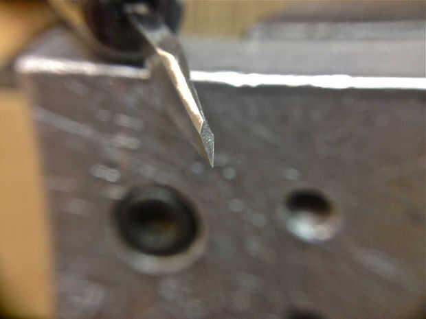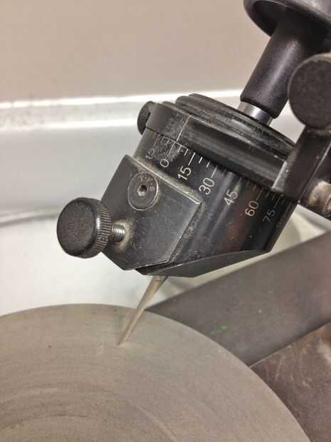 Ahora moler la cara del buril de corte. Todos los ángulos de afilado más graves se hacen en relación con el borde inferior del tenderete. La cara del tenderete se corta generalmente en un ángulo de 55 grados con una rueda de 600 grano, seguida por una rueda de cerámica que pule la cara de corte. Buriles planos Haz un paso adicional: la parte inferior plana del tenderete obtiene un alivio de 10 grados de tierra y pulido-esto le dará un acabado más agradable cuando corte plano áreas. Si no quieres moler tus propios buriles hay buriles disponibles que son ya del suelo forma y listo para su inserción en el mango de su elección (véase la sección de herramientas).