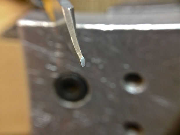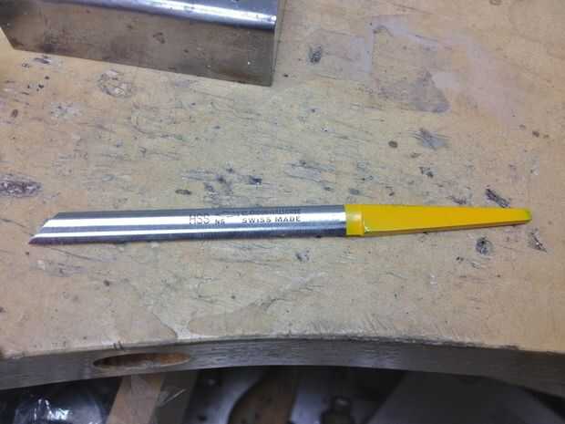 Una vez que tenga un mango montado el siguiente paso es moler un relieve en la parte posterior del tenderete. Este relieve tiene dos propósitos-en primer lugar, que le da mayor espacio al trabajar en un espacio confinado y el segundo, hace afilar mucho más rápido ya que ahora está afilado de un área mucho más pequeño. Después de retira el área del alivio de la muela un cartabón en cada lado del borde del alivio.