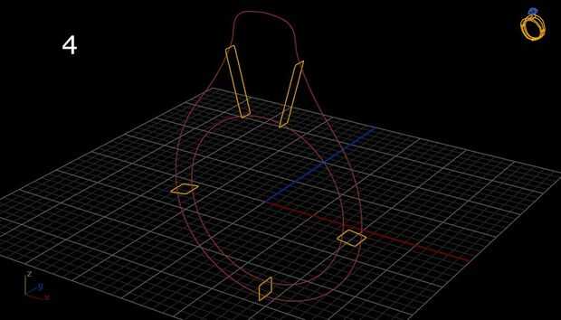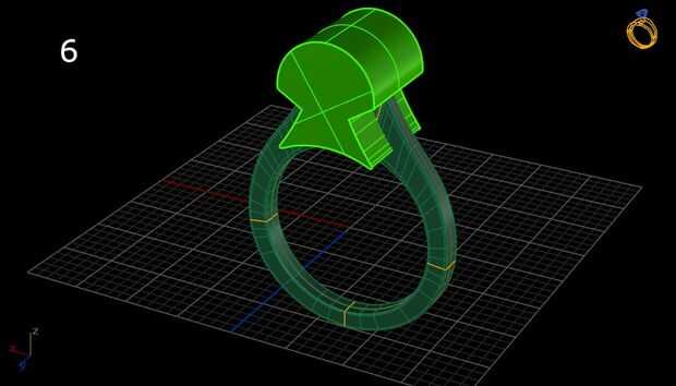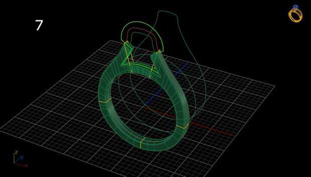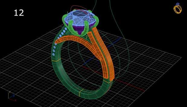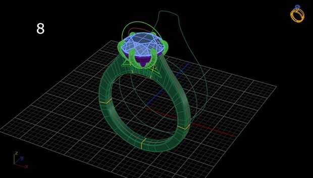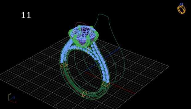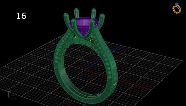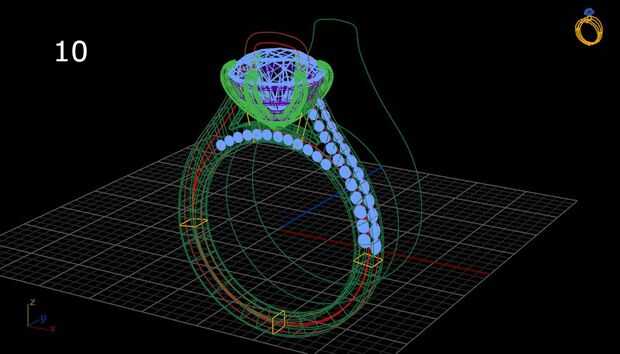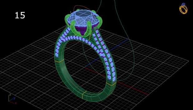 Cuadro #15- la adición de pequeños granos que sostienen las piedras en su lugar. Esto entonces se procesa para mostrar al cliente para dar una idea aproximada de lo que el anillo se vería cuando terminó. Tenga en cuenta que el estilo de ajuste se muestra aquí de piedra es diferente de la del anillo terminado. El modelo de CAD muestra lo que se llama un entorno compartido del grano, mientras que el acabado del anillo utiliza lo que se llama un ajuste de cuentas individuales.