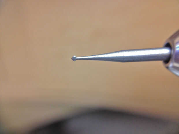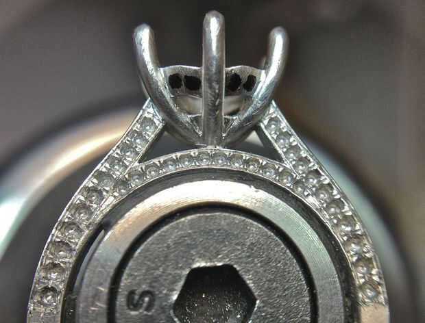 Ahora tomo una fresa recta de ajuste del mismo tamaño que la piedra y hacer el agujero justo lo suficientemente grande como para sostener la piedra. La fresa de ajuste debe colocarse lo suficientemente profunda en el agujero para que la parte superior de la piedra (la mesa) debe ser apenas debajo de la superficie del anillo.
