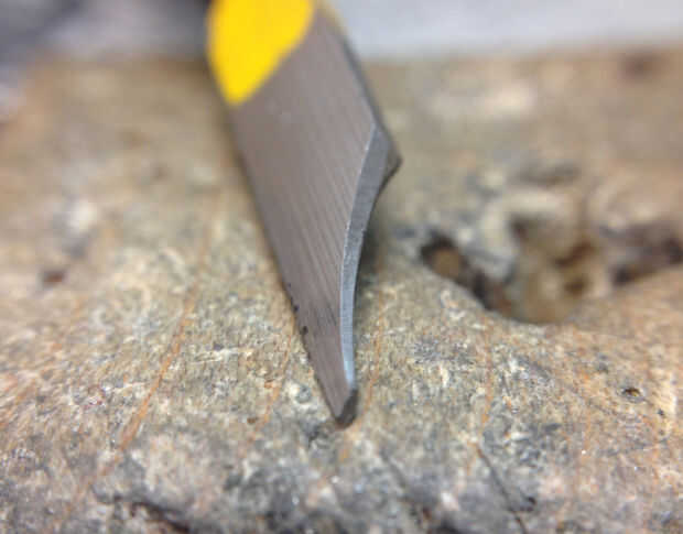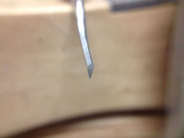 Ahora uso un buril plano pequeño y corte el área entre el centro de los agujeros pequeños y las fronteras. Esto crea las secciones triangulares pequeñas entre los agujeros. Ahora con mucho cuidado utiliza un filo más grave y fractura de la parte superior de cada sección triangular. Tener un microscopio estéreo realmente ayuda con este proceso. Tienes que tener bastante cuidado al dividir la parte superior de las secciones triangulares pequeñas como usted puede fácilmente arrancar un trozo de metal, especialmente cuando se trabaja con algo este pequeño.