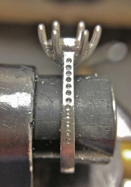 El primer paso para prepara el anillo para ajuste de piedra es taladro de pequeños agujeros donde el se colocarán las piedras. Empiezo primero con las piedras más pequeñas. Las piedras más pequeñas son diámetro de .8mm usé un taladro #72 (diámetro .63mm) para perforar los agujeros poco profundos. El taladro era necesidades sólo ligeramente más pequeño que el diámetro de la piedra para establecerse. Los agujeros sólo hay que perforar más allá de la profundidad de la piedra que se establecerá, por lo que la parte inferior de la piedra no afectará a la parte inferior del agujero cuando se establece.