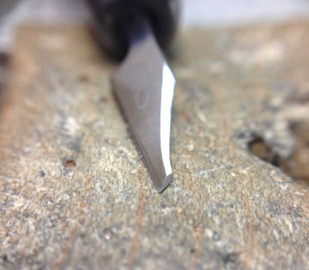 A continuación tengo el anillo en un accesorio (sostenedor del anillo Benchmate GRS) y usando un onglette grave cortar una línea a través del centro de los agujeros que ha perforado. Entonces yo cortar líneas a lo largo de los bordes exteriores de las piedras-estas líneas crean las fronteras de las piedras.