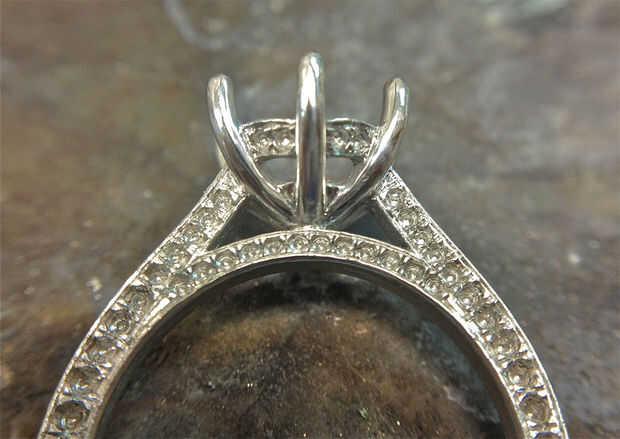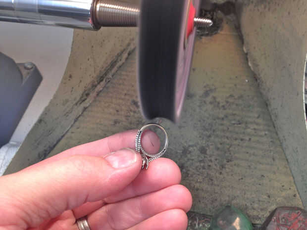Una vez que estoy contento con las grandes áreas repito el proceso de pulido alrededor de las áreas de detalle usando cepillos pequeños con mi herramienta rotatoria. Después de usar los cepillos se pone el anillo en un limpiador ultrasónico para eliminar todo el compuesto para pulir y entonces se cuece al vapor seco. Al final debe tener un agradable incluso alto brillo por todo el anillo.