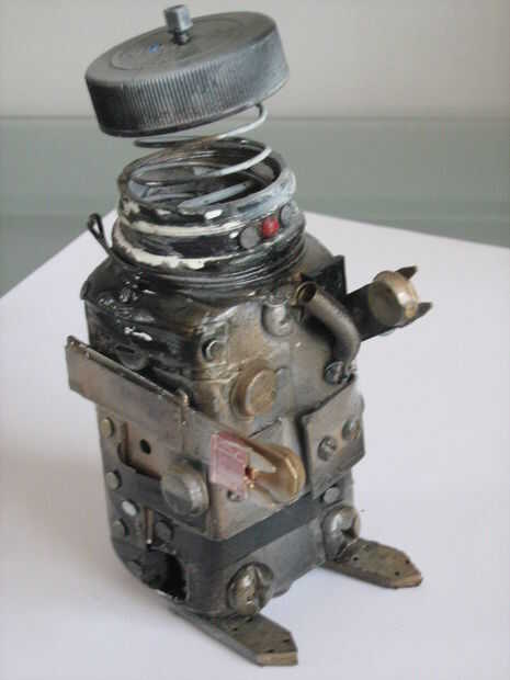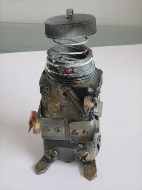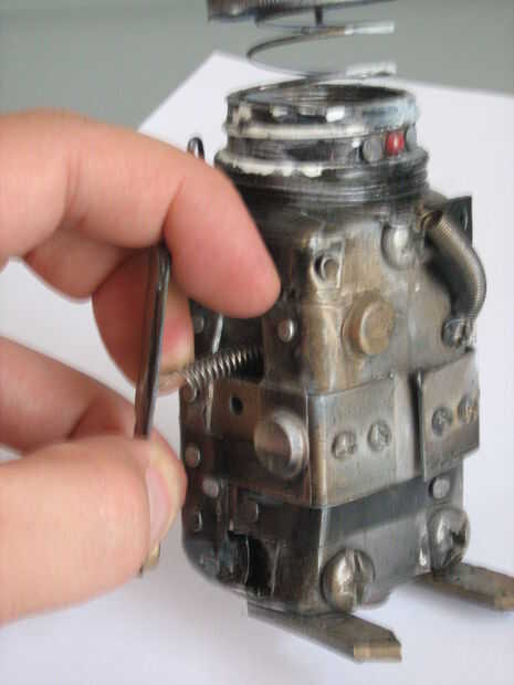 El grifo está conectado al matraz como un tornillo... y cuando tire hacia arriba, un oculto, resortes de alambre aparece la cabeza, haciendo un look divertido robot.