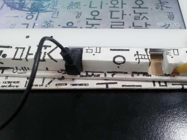 El otro lado, con el conector de alimentación, fue evidente Cómo recortar. Una gran ventaja que no era plan, fue la mejora de la calidad de sonido! Antes, el sonido era ' ok'' pero ahora, con la cartulina soporte allí, el sonido es mucho más directa y más fuerte! No se como dispersos en el ambiente. Me encanta sorpresitas así :)