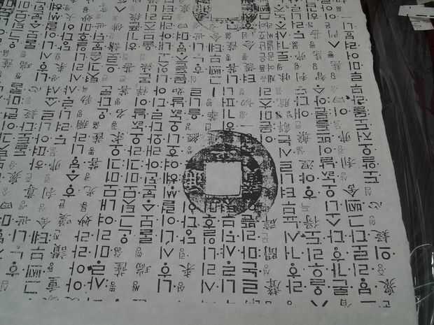 , Mi plan original era un viejo libro de Coreano. Pensé que sería cool tener algún título de libro Coreano como cubierta. Viendo que esto no sucedería, me fui con lo mejor. Tiendas de arte coreana son una maravilla de la variedad. Podía pasar horas solo vagando por el más pequeño de ellos porque sólo llevan muchas cosas. Una de las cosas que llevan es grandes hojas de papel con dibujos. Para una friolera de 1.300 Won (unos $1,10) tengo esta hoja gigante de papel con original Hangul (coreanos caracteres, ligeramente anteriores a la versión actual de su alfabeto).