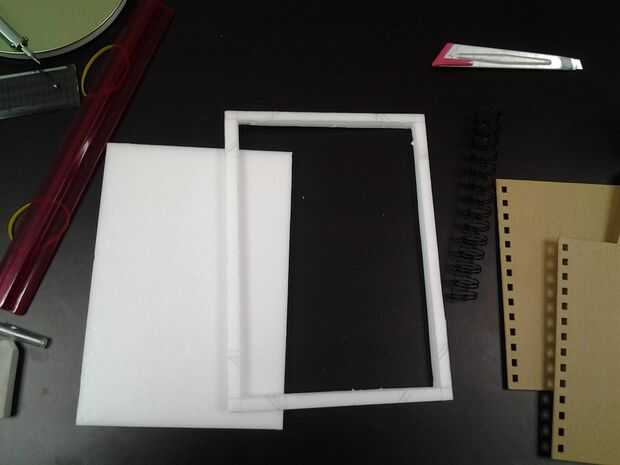 Ok, la pastilla tuvo que sentarse dentro de un marco. Apriete lo suficiente para evitar la caída accidental pero lo suficientemente suelta para que se no estaba poniendo enorme presión sobre la parte encolada hacia abajo. Compré este gigante hoja de tablero de la espuma y una de las cubiertas de almohadilla de bosquejo trazado. Entonces coloqué mi Galaxy Tab y trazar. Un par de ajustes más tarde, obtuve mi marco básico.