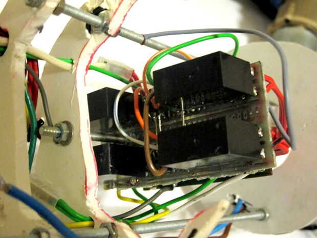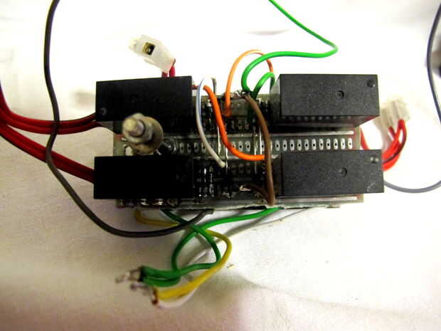 Motores son controlados muy simple. Como los motores son grandes, usted no puede poderles de la Junta de donantes directamente. Utilice cuatro relés que se controlan desde las salidas del receptor. Todo lo que necesitas es el motor actual pasando por los relés cuando el canal deseado recibe señal. Me di cuenta de que el receptor las salidas son alrededor de 5V, a pesar de el 12V relés todavía funcionan. Se pueden utilizar relés de 6V si usted encontrar - es perfecto. No te olvides de soldar un diodo reverso parcial en el relé de entrada. Libera la bobina de la corriente al apagar el relé! Comprobar el diagrama!