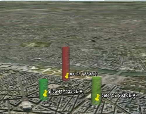 Monitoreo en tiempo real se propone visualizar la exposición al ruido colectivo de participantes utilizando Google Earth. Puedes verlo yendo a http://noisetube.net/public/realtime.kml. Un usuario es representado por un cilindro cuya altura y color es proporcional con el volumen (Leq medido en dB de la exposición de sonido del usuario.
