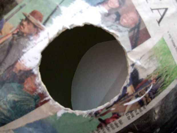 El proceso comenzado con la compra una pelota grande de playa sin costuras, luego que se rasgó para arriba un montón de periódicos en pulgadas de ancho tiras, diluido un montón de cola para madera, empapado las tiras de periódico en la cola para madera y aplicado a la bola de playa. Lo hice muchas veces para desarrollar una cubierta de múltiples capas de pegamento y papel sobre la bola. Dejo todo seco después de cada capa y construido sobre capas de 5-6. Dejar que este seco completamente durante algunos días dio lugar a una esfera muy dura y fuerte. Me corte un orificio en la esfera para servir como el puerto de entrada, apareció la bola y luego cortar el conjunto de la esfera por la mitad para pintar el interior e instale la placa deflectora. Antes de pintar te desea que corte el puerto de salida en una de las mitades y cualquier otro puerto que puede. Colocación de los puertos de entrada y de salida es algo arbitraria, pero separados por 90 grados sobre la esfera es un buen lugar para empezar.