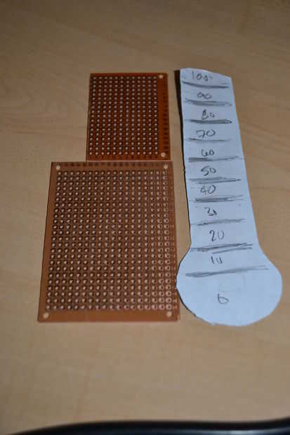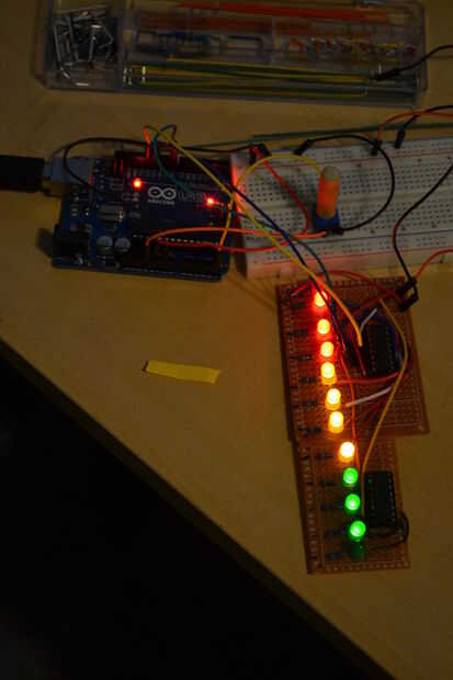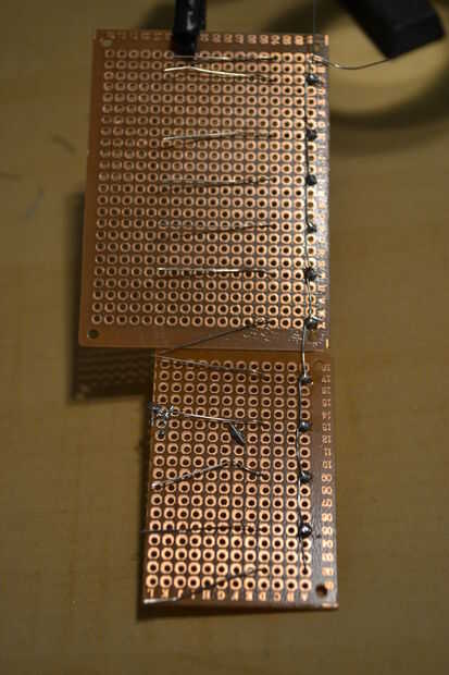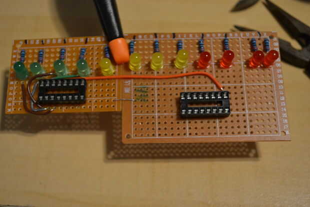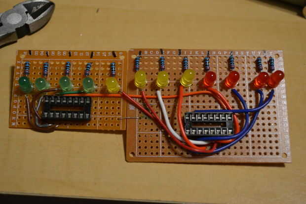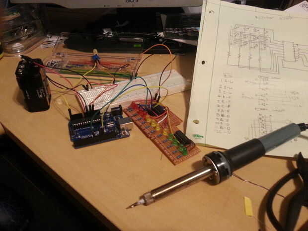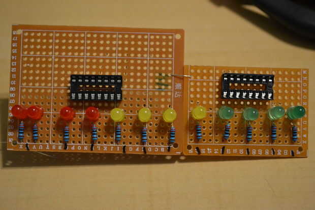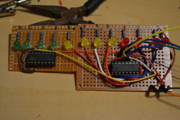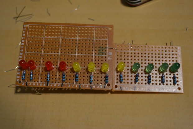 Empecé colocando las resistencias ya que están en el borde y establece el espacio para los LEDs. Las piernas de la tierra de las resistencias se atan para recoger. Luego soldar el LED al lado de las resistencias. Las tomas para el 595 se colocan cerca de los LED que se controlan. Yo no he trabajado mucho con el tablero de PC y no me dejo mucho espacio. Si tienes un cable de cinta que aquí recomiendo. Si tuviera que volver a empezar es lo que yo usaría. Antes de conectar todo junto he añadido lleva tiempo flexible, con clavijas compatibles del encabezado de Arduino, a la Junta como corbata en nodos para GND y + 5V. Con todo en su lugar, siga el diagrama del circuito y todas las conexiones 595. Tenga cuidado cuando los bancos entre la espalda y el frente de la JCP. Había hecho un par de conexiones cuando empecé antes de que noté que había cambiado de puesto los pasadores y tuvo que desoldar y volver a empezar. Los cables de datos, reloj y pasadores de cierre deben largos y extremos compatibles de la rúbrica de Arduino.