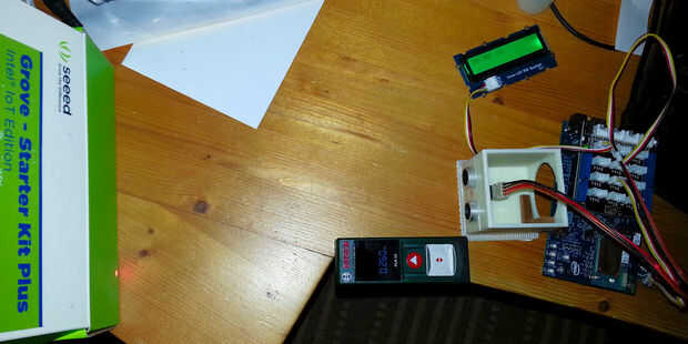Como ya sabrás, Telémetros láser son aún costosos para las multitudes ocupa vanamente, usé un sonar de HC-SR04 muy barato que tenía por ahí. Resulta que la plataforma Grove con su desglose estandarizado hace fácil conectar también no Grove circuitos, como el sonar de HC-SR04. Tuve que cambiar las conexiones (mediante la conexión de un segundo cable de 4 pines) de GND VCC-D8-D9 de la Junta de Grove a GND-eco-gatillo-VCC del sonar, por lo que pude controlar el disparo de Pin 7 de Arduino Edison y eco de 8 Pin