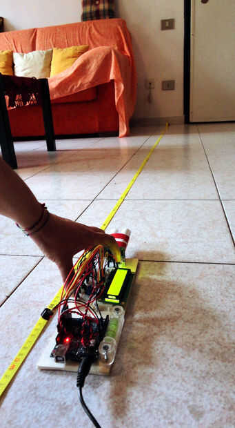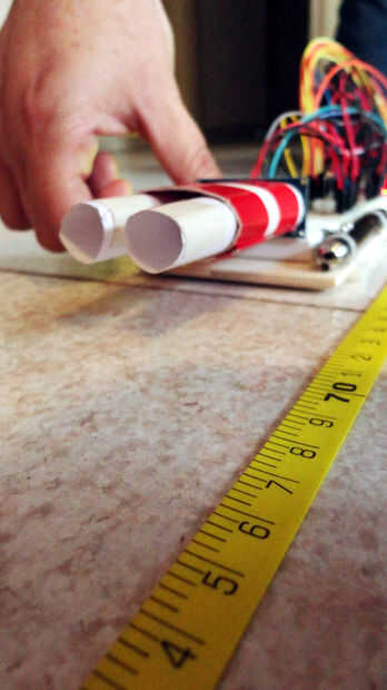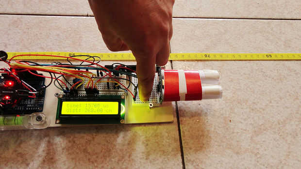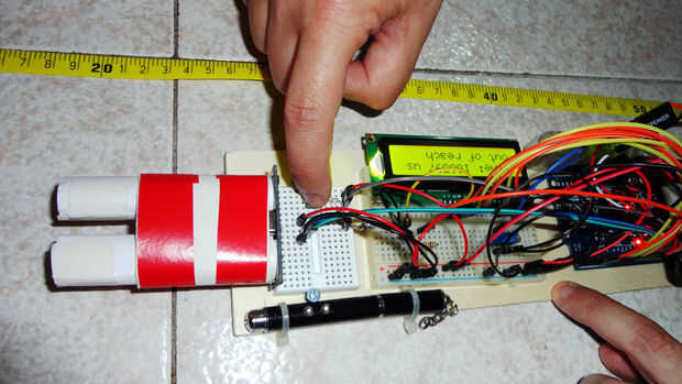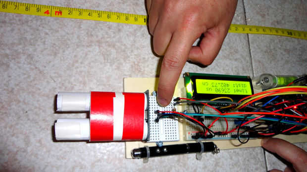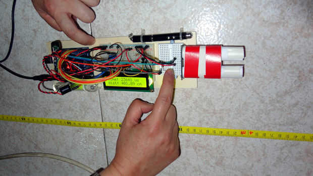 Lo útil es un par de tubos de papel (nuestros son 7,5 cm de largo) que tiene que ser colocado delante de los dos altavoces del módulo ultrasónico. Sean necesarios para enfocar los pulsos ultrasónicos que sale por los altavoces del módulo ultrasónico, que de otra manera divergen demasiado. De hecho, según la hoja de datos, el ángulo de medición es de 15 grados.