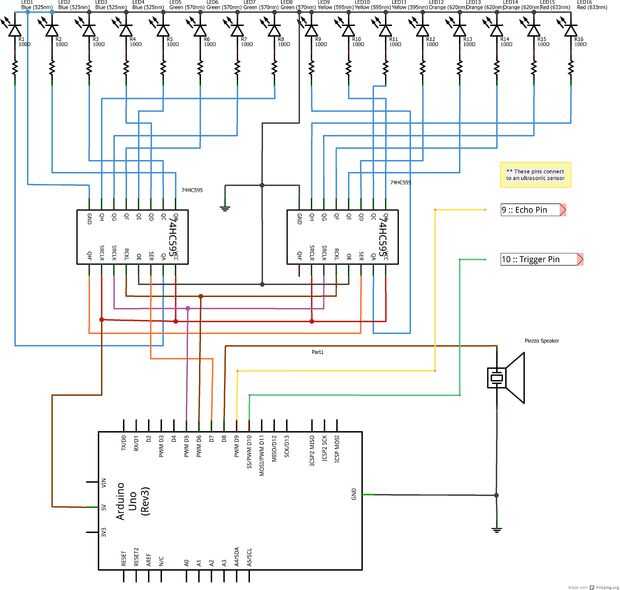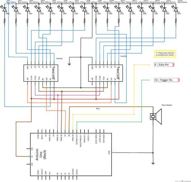 Resumen:Se trata de un circuito de detección de distancia simple con el uso de un sensor de ultrasonidos, un zumbador, una fila de LEDs, y 2 relés (opcional).El sensor de distancia ultrasónico encenderá una fila de LEDs dependiendo de distancia. Si s