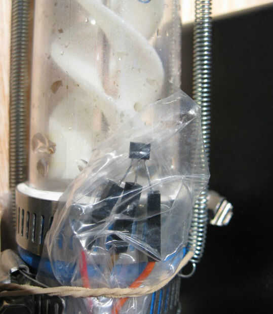 Coloque el sensor de efecto hall (HES) dentro de una pequeña bolsa de plástico y cierre herméticamente con una banda elástica. Con otra pequeña goma ajuste HES al frente de la turbina, con el extremo abierto de la bolsa hacia abajo. Coloque el sensor lo más cerca posible de los imanes en la turbina.