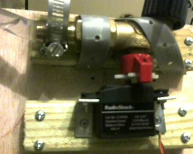 Conecte ambos 1 "x 2" x 4 "pieza de madera como se muestra en la imagen. Montaje servo y manguera babero con soportes y tuberías montaje correa ajustada juntos. Si ellos no están montados cerca bastante, el servo se resbale de la manija de la manguera y no gire correctamente. Para juntas puede dañar el servo, o podría tener demasiada fricción para encender correctamente. Probablemente tendrás que ajustar un par de veces.