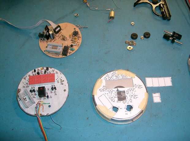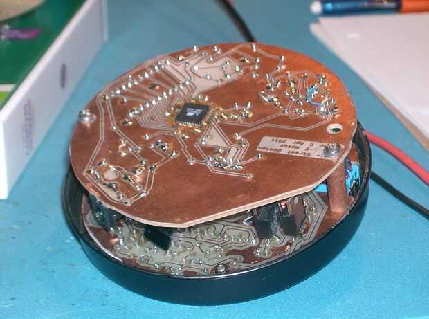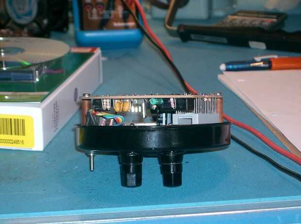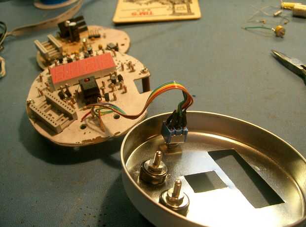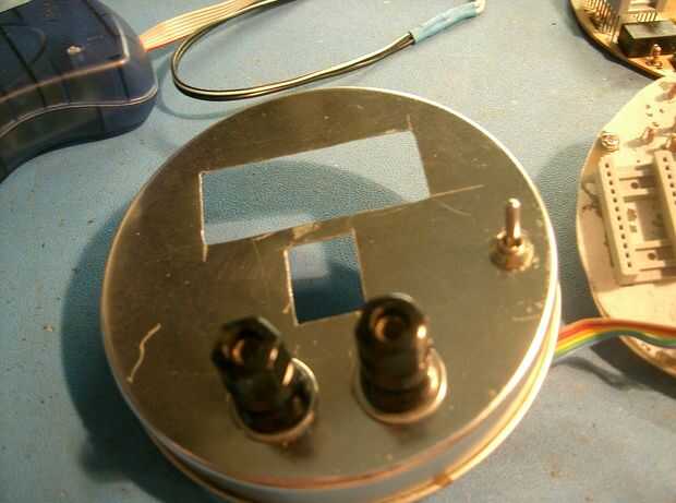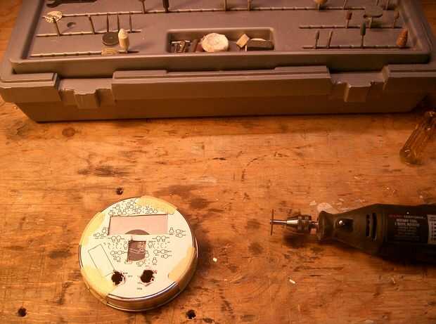 La etiqueta original de la tapa fue quitada con agua caliente y acetona. Grabando una copia de la colocación del componente tablero superior de la tapa de la lata de que los orificios necesarios podrían ser cortan con un taladro o con una herramienta Dremel con un disco de corte en él. Los filos se suavizó con un pequeño archivo.
