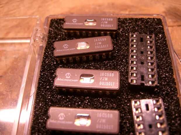 También tenía cuatro de las fichas PIC16C58B que están en el paquete más pequeño de DIP-18 (se muestra). Probé todos y estaban todos reconocidos, leer y programados con éxito así como un chip EPROM al azar. Exonera el EMP-21, la configuración, mi ordenador portátil y los cuatro chips de PIC16C58B. Y yo estaba jodido porque todos los chips más grandes eran tostadas. (Y antes de que nadie lo menciona, aseguro que los módulos de derecho de la personalidad, tipos de chip, etc. fueron seleccionados en el EMP-21).