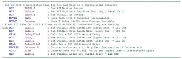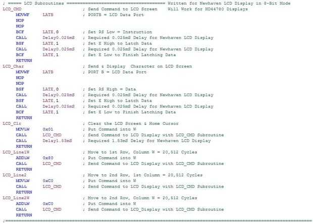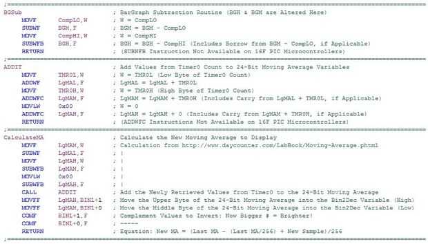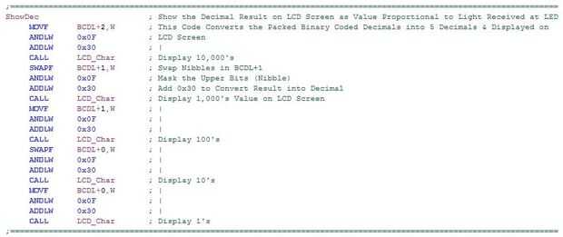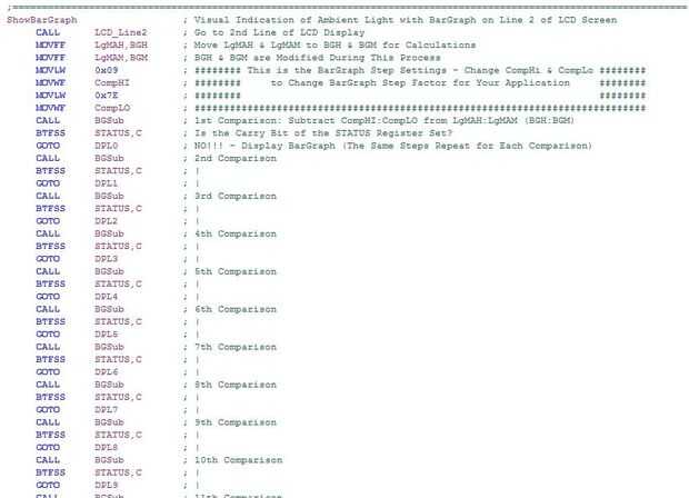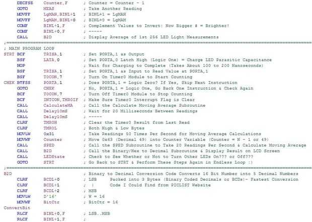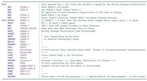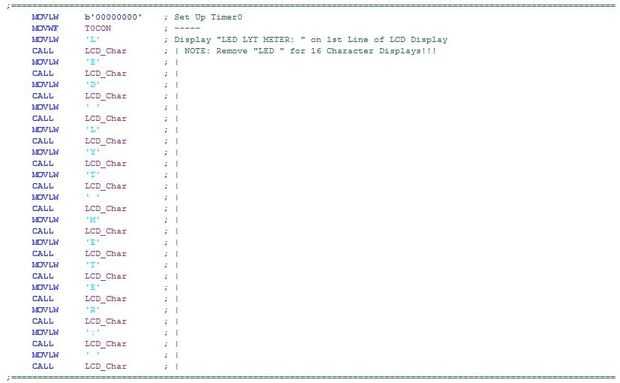 Lo que hago es mostrar algunas de las principales secciones del código que es esencialmente lo que hace el LED de tomar las medidas, etc.. El código fuente que he suministrado se ha comentado mucho así que si usted tiene alguna experiencia de microcontrolador PIC en todos debe ser capaz de seguir lo que estaba haciendo al escribir el código. No dude en descargar el código y seguir. Hay dos versiones aquí. La primera versión está programada para utilizar una pantalla de LCD de 20 x 2 caracteres, el segundo utiliza una pantalla de 16 x 2 caracteres en lugar de otro.