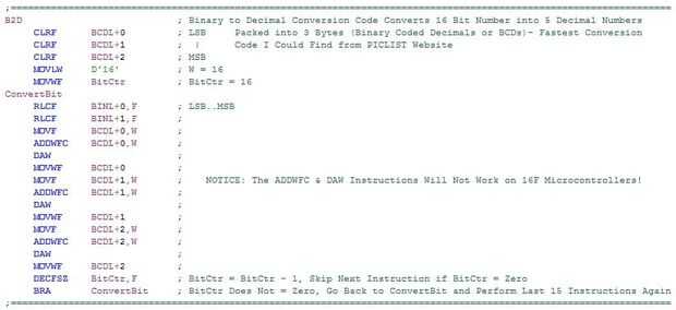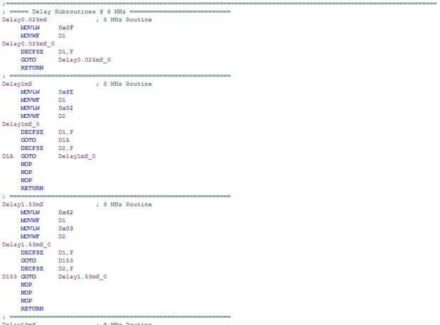 El código también está dirigido a una velocidad de reloj de 8 MHz. Tienes que modificar el código para obtener el tiempo correcto si utiliza cualquier otra velocidad de reloj (es decir, 20 MHz). También aproveché de usar el oscilador interno del microcontrolador como la fuente de reloj también. El esquema muestra un oscilador externo o cristal para aquellos de ustedes que prefieren utilizar una fuente de reloj externa. Si necesita cambiar las subrutinas de retardo puede encontrar una página web muy útil para producir el código que usted necesita. Que se encuentra en: PIC de Microchip, generador de código ASM demora.