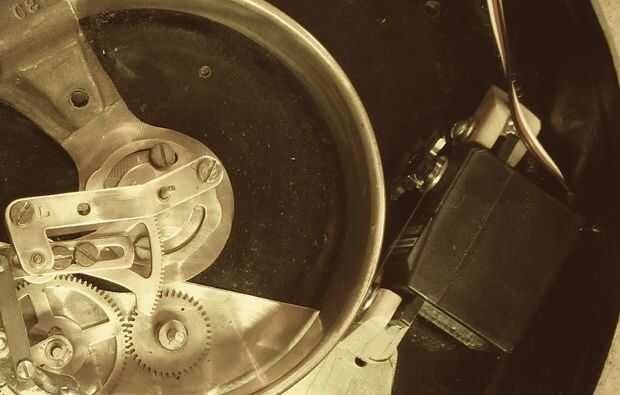 Sin la presión de vapor para crear la flexión, el tubo de Bourdon es esencialmente rígido "C" en forma de resorte. Mientras que puede ser flexionada abierta a mano, y creando así el movimiento del puntero del dial deseada, la fuerza necesaria para hacerlo no es insignificante. El desafío, el espacio disponible dentro del calibrador para el montaje de algún tipo de actuador es limitado. Pude determinar que un servo de rotación continua cabrían en el espacio entre el tubo de Bourdon y el caso. Esto muestra la configuración de montaje final del servo. Detalles sobre cómo y por qué exactamente ese punto en pasos posteriores, pero baste para decir que había suficiente espacio para hacerlo funcionar.